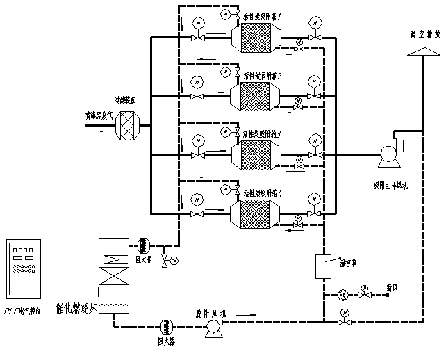 - 系統(tǒng)由4個活性炭吸附箱(3用1備),1個催化燃燒床構(gòu)成,將各條生產(chǎn)線中的所有排氣管合并連接引至凈化設備,各個支管上安裝一只手動調(diào)節(jié)閥,配比例調(diào)節(jié);廢氣經(jīng)收集匯總后送入集氣箱,再將廢氣送入干式過濾器,干式過濾器能更為精細的祛除廢氣中的粉塵和漆霧,從而避免活性炭微孔被堵塞,延長活性炭的使用周期,活性炭吸附器接近飽和時,系統(tǒng)將自動切換到備用活性炭吸附箱(此時飽和活性炭吸附箱停止吸附操作),然后用熱氣流對飽和活性炭吸附箱進行解吸脫附,將有機物從活性炭上脫附下來。在脫附過程中,有機廢氣已被濃縮,濃度后的濃度較原濃度提高幾十倍,達2000mg/m3以上,濃縮廢氣送到催化燃燒裝置,最后被分解成CO2與H2O排出。完成解吸脫附后,活性炭吸附器進入待用狀態(tài),待其他活性炭吸附箱接近飽和時,系統(tǒng)再自動切換回來,同時對飽和活性炭吸附器進行解吸脫附,如此循環(huán)工作。最后凈化后的潔凈氣體由主排風機排入大氣中。